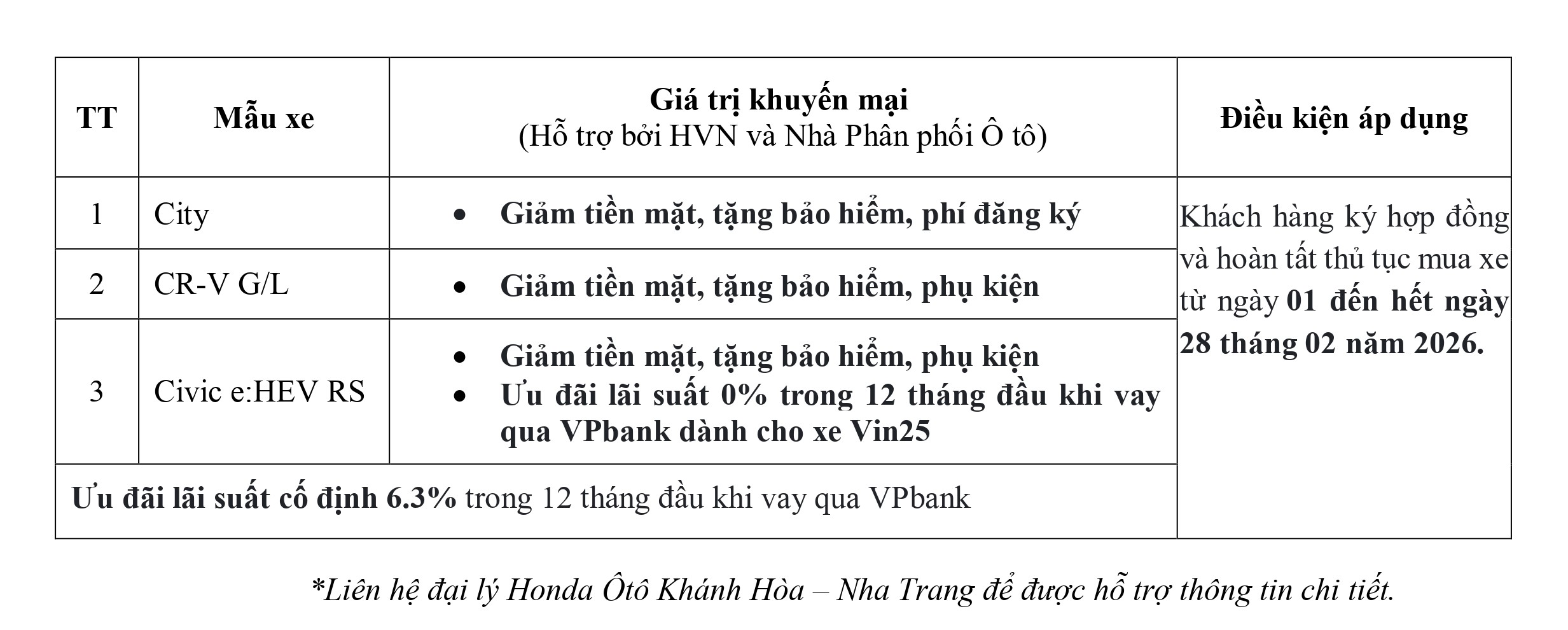 Khuyến mãi Honda tháng 2.2026 - Honda Ô tô Nha Trang - Hotline 0905 254 255