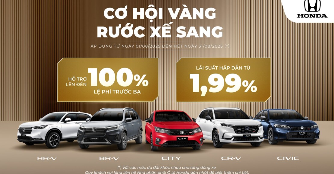 Với mong muốn mang đến nhiều hơn nữa cơ hội trải nghiệm các mẫu xe ô tô Honda và tận hưởng những khoảnh khắc du ngoạn tuyệt vời cho Khách hàng, Honda Việt Nam (HVN) phối hợp cùng hệ thống Nhà Phân phối triển khai chương trình ưu đãi hấp dẫn từ ngày 01 tháng 08 năm 2025 đến hết ngày 31 tháng 08 năm 2025.